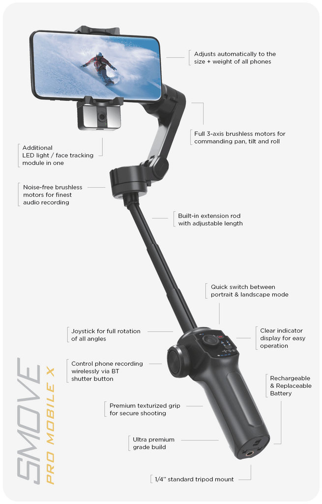 Receive (1) SMOVE PRO MOBILE X Pro Tripod Kit: stabilizer for smartphones with a built-in extension and SAVE 40% and $90 OFF future retail tripod included -> Limited quantity -> Prices go up.